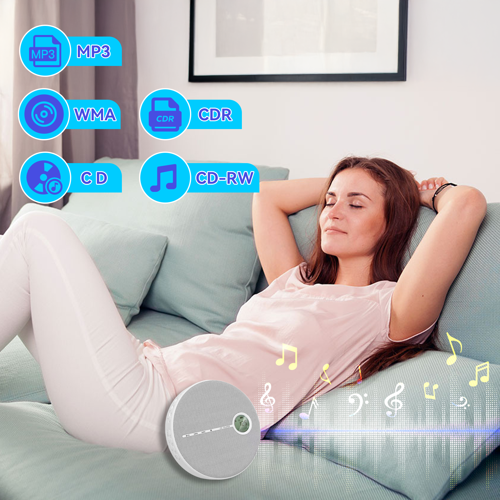 The Smileboxy CD player supports multiple formats like MP3, WMA, and CD, ensuring you can easily play various audio files. Whether it’s music, podcasts, or audiobooks, it’s fully compatible to meet all your listening needs.