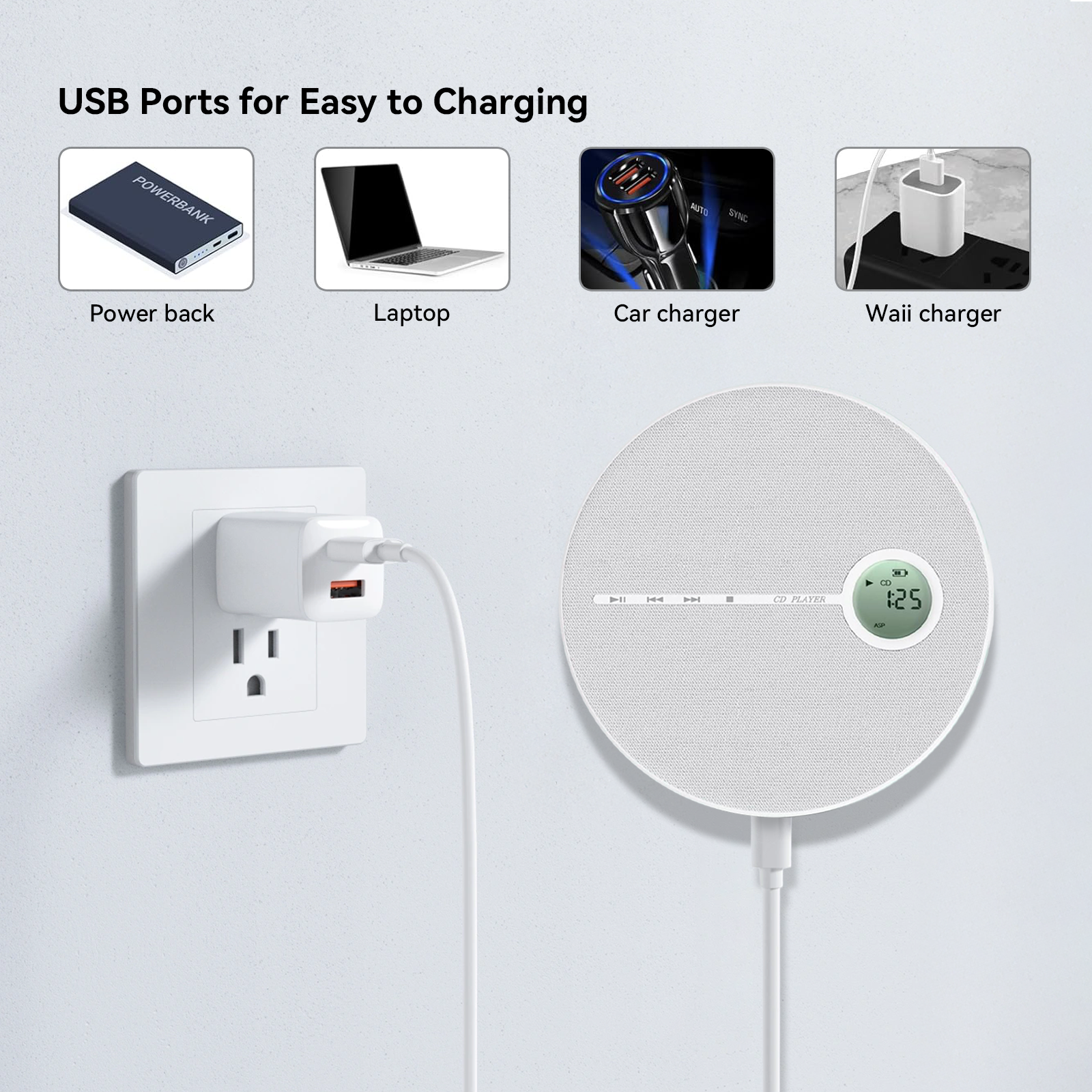 The Smileboxy CD player supports USB charging, making it easy to recharge whether you're at home, in the office, or in your car. With compatibility for car chargers, laptops, and power banks, convenient charging ensures your music is always ready to go.