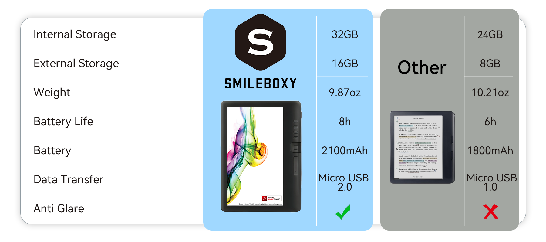 Thus, Smileboxy was born. The brand emphasizes lightweight portability, eye-friendly display, and powerful performance, featuring a 7-inch glare-free screen, 2500mAh long-lasting battery, and a vast built-in library—allowing users to enjoy a clear, comfortable, and uninterrupted reading experience wherever they go.
