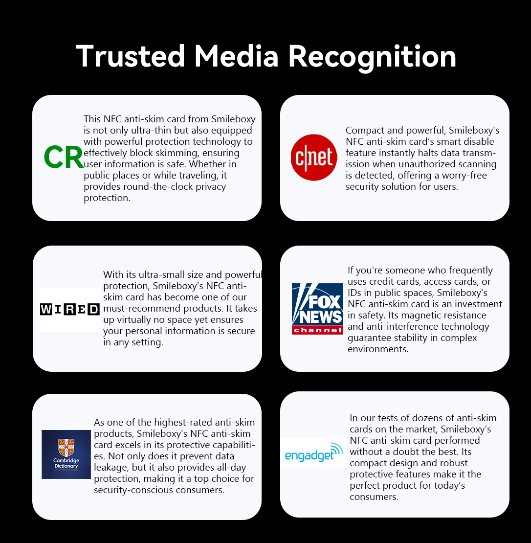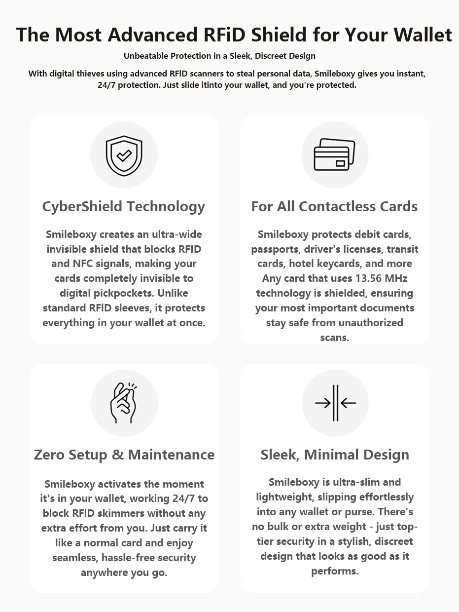 Smileboxy uses advanced RFID-blocking technology to create a 5cm electronic shield around your cards. This instantly blocks skimmers and unauthorized RFID/NFC scans, keeping your credit cards, IDs, and passports safe in crowded places like airports, malls, and public transport.